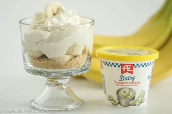 Like I said this snack is so simple and easy to throw together in the 5 minutes after kids get home from school, or after dinner for a healthy dessert! All you need is a package of graham cracker crumbs (or crush your own from a few graham crackers), a banana, whipped cream & AE Banana Custard Whole Milk Yogurt. Layer the ingredients and you’re done!