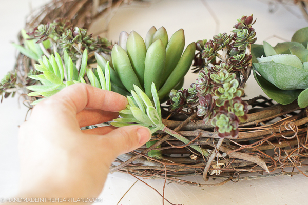 - 18” Grapevine wreath– I love the way the grapevine wreath naturally “grabs” the stems as you stick them in. I didn’t even have to hot glue it together because the succulent stems were secure enough in the grapevine wreath to stay put.